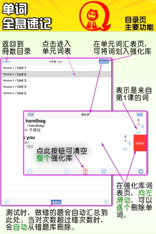 测试时做错的题目会自动进入”错题库“,当再次测试错题库的词条,且做对次数大于做错次数时,该词条会从错题库中自动删除。