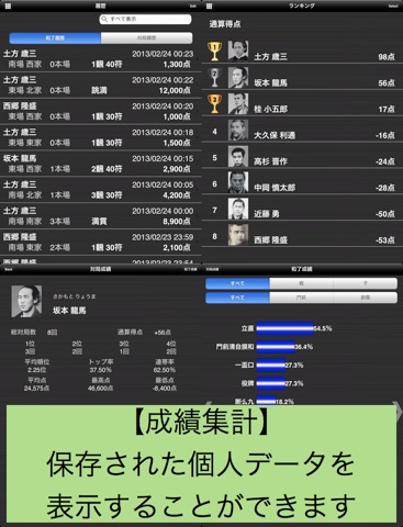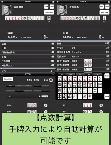 役とか符を確認できるので便利です。 操作も直感でわかりやすい。 残念なのが、私のipad2(ios5.1.1)では、得点集計で数値を入力 しセーブを選ぶと落ちます。