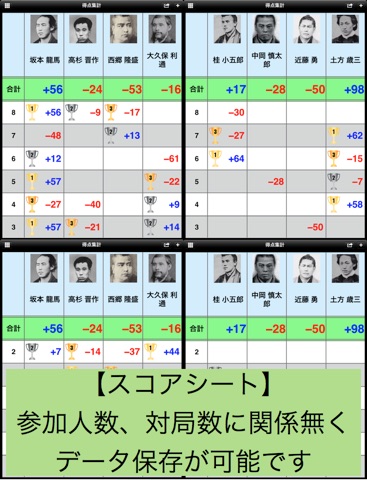 上がりの傾向などが記録出来たりしてとても便利だと思います。プレイヤーの並びを後から変える事が出来ない事やいちいち参加者をオンにする作業などを改良して欲しいなと思いました。 あいうえお順に並び変える機能 月別にスコアを比べる機能も欲しいと感じました。