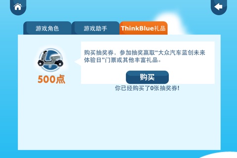 当然,你还可以到蓝色商店中购买道具来帮助你取得更好的成绩,你更可以换取抽奖券,赢得“大众汽车蓝·创未来体验日”门票,以及其他丰富礼品。