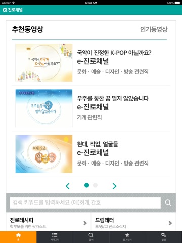 e-진로채널 모바일앱은 커리어넷의 모든 동영상 콘텐츠를 총망라하여 카테고리별로 확인할 수 있습니다.