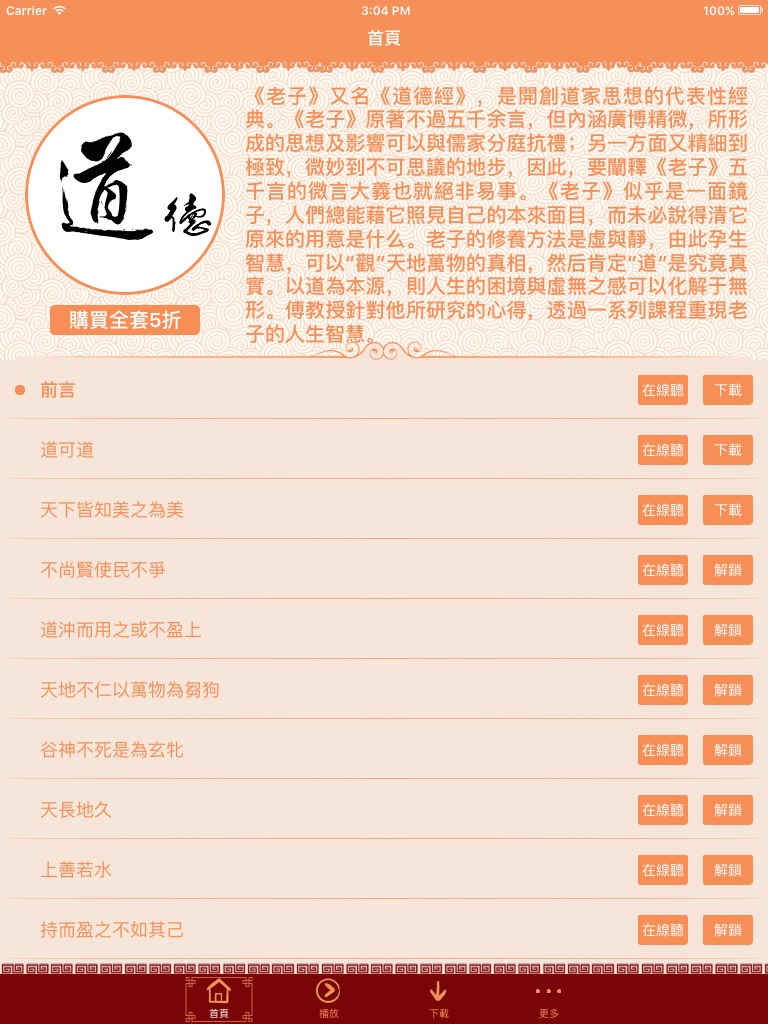 《道德经》即《老子》,是开创道家思想的代表性经典。《道德经》原著不过五千余言,但内涵广博精微,所形成的思想及影响可以与儒家分庭抗礼;另一方面又精细到极致,微妙到不可思议的地步,因此,要阐释《道德经》五千言的微言大义也就绝非易事。《道德经》似乎是一面镜子,人们总能藉它照见自己的本来面目,而未必说得清它原来的用意是什么。老子的修养方法是虚与静,由此孕生智慧,可以“观”天地万物的真相,然后肯定“道”是究竟真实。以道为本源,则人生的困境与虚无之感可以化解于无形。傅佩荣教授针对他所研究的心得,透过一系列课程重现老子的人生智慧。