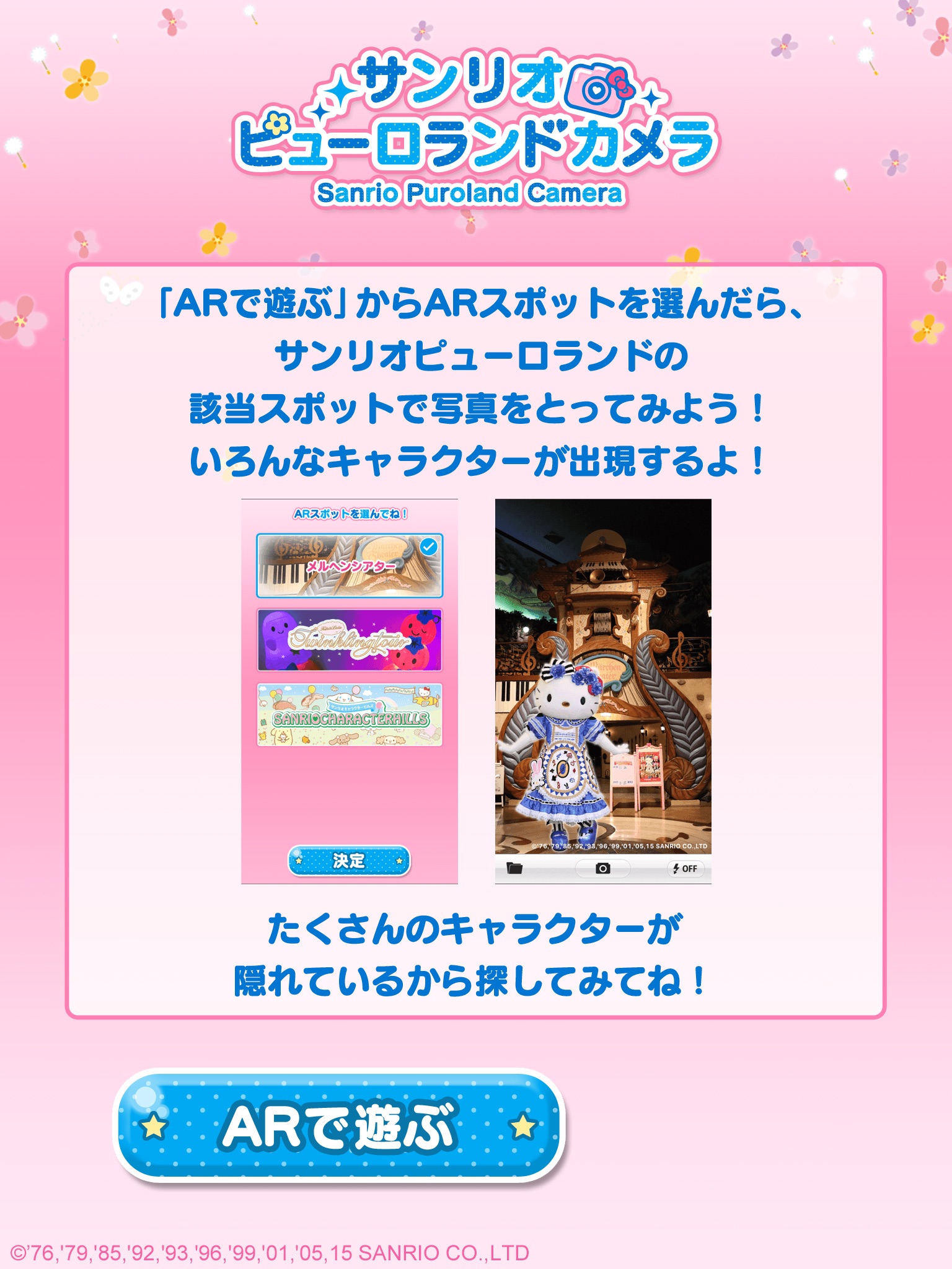 サンリオピューロランドの数か所のスポットでキャラクターと一緒に写真撮影ができるアプリだよ!