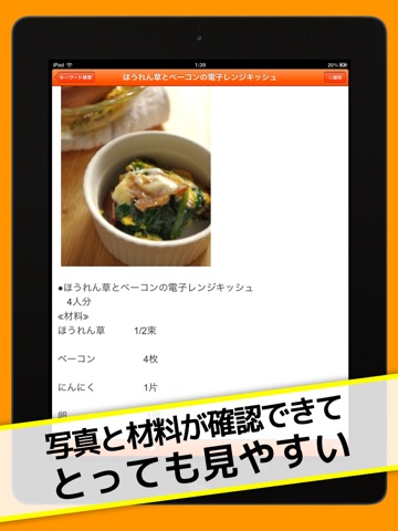 検索から食材を打って検索すると、レシピが沢山出てきます。食材が余った時に使えますね。これを見ながら、料理も出来るし便利だと思います。