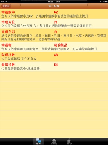 ◎每日指數---配合您的生辰推算當日財運、愛情、事業等吉凶指數及方位,並告訴您當日的幸運數字、方位、色彩及幸運物,讓您好運連連。