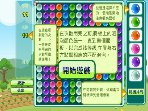 點擊屏幕右側一列中的其中一個顏色泡泡小球,這些小球圖標會轉換屏幕左上角的泡泡小球。相匹配的泡泡小球會粘在一起。在可用的次數用完之前,努力去完成板面上相匹配的泡泡小球,直到你闖過這一關!
