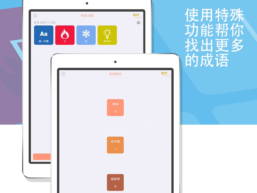 三种不同难度任你选择,运用各种有趣的特殊功能帮你找出更多的成语。