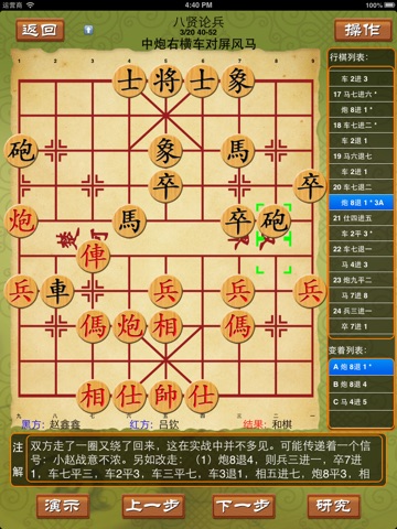 ◎可以手动或自动的动画演示每一部棋谱,而且还能从某一状态研究该棋局。