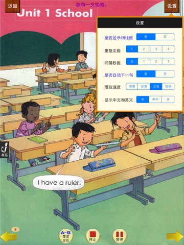 本程序除了像普通点读机一样能点读课本外,还能设置【是否自动下一句】、【朗读重复次数】、【朗读延时间隔】、【显示中文和英文】、【点读速度调节】功能。