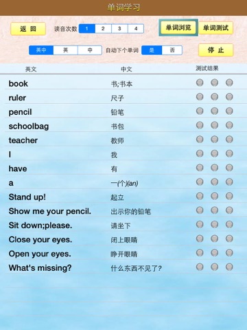 单词学习模式包括单词浏览、英文点读中文、中文点读英文、单词默写功能。