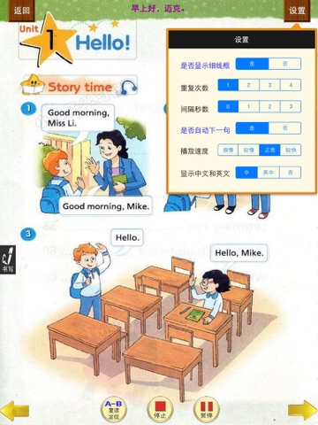 本程序除了像普通点读机一样能点读课本外,还能设置【是否自动下一句】、【朗读重复次数】、【朗读延时间隔】、【显示中文和英文】功能。