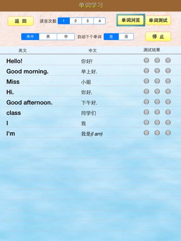 单词学习模式包括单词浏览、英文点读中文、中文点读英文、单词默写功能。