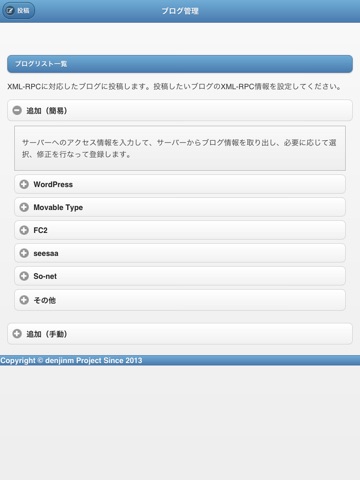 あらかじめ投稿先を登録しておくことで、いくつものブログに、このアプリから投稿できます。