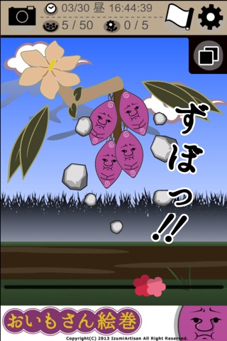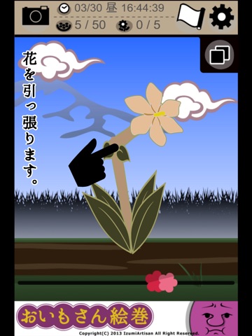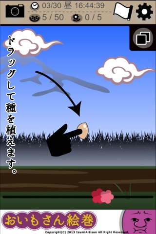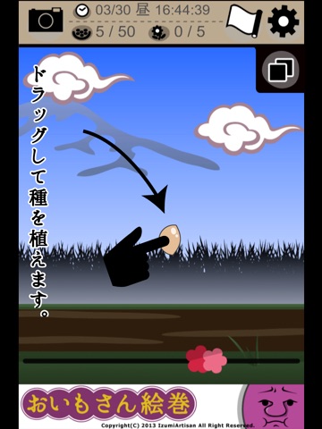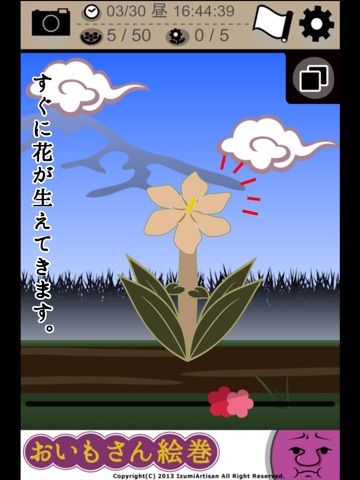 注)当アプリは、端末の時計機能を利用して設計されています。時間を進めてもおいもさんは収穫できますが、時間を戻すと、進めた時間分だけはどんな種を植えたも普通の花しか咲かない状態になりますのでご注意ください。