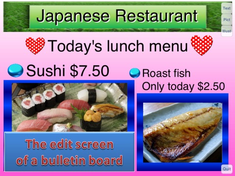 In creation of a bulletin board, a photograph, an illustration, and a character can be arranged freely.