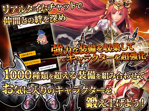 騎士団を創設・参加することで強大なモンスターに戦いを挑もう。ギルド同士の大戦争も開催!チャットで仲間と一緒に協力バトルで相手を攻略!