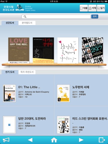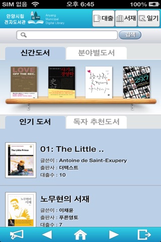 안양시 도서관의 도서이용 서비스를 스마트 폰에서 손쉽게 사용할 수 있도록 구성하였습니다. 도서의 검색에서 시작하여 도서 대출현황, 예약, 신청 등 도서관에서 이용할 수 있는 기능을 안양시립 도서관 홈페이지를 접속하지 않더라도 스마트폰을 통하여 언제 어디서든지 이용할 수 있습니다