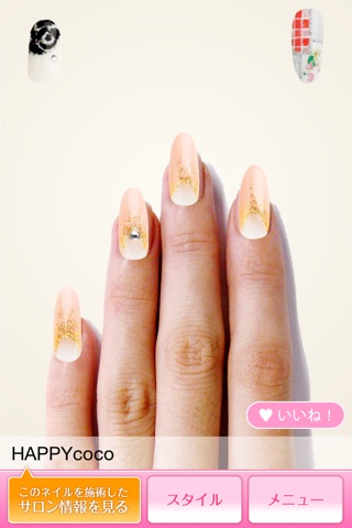 京都のネイルサロンのネイルアートを自分の左手の爪(人差し指、中指、薬指、小指)にきせかえて楽しめるアプリ♪