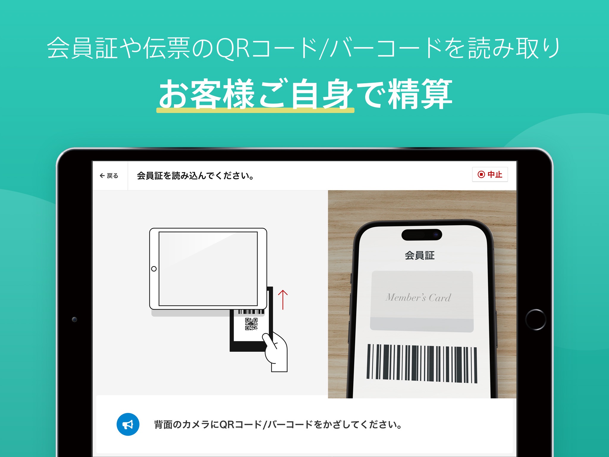 会員証や伝票などのQRコード/バーコードを、お客様自身で読み取り、お支払いが可能です。