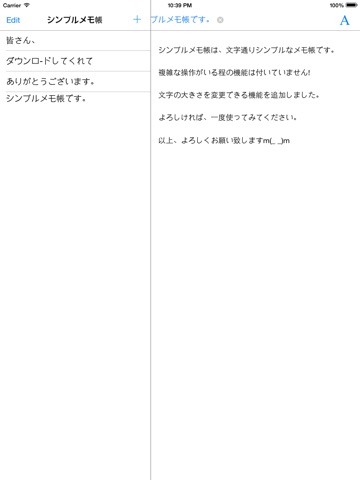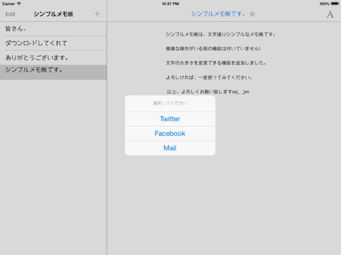 愛用させてもらってます^ ^ いい点 ・文字の大きさが変更可能 ・タイトルがつけられる 改善要望 ・メモ一覧の画面でメモの1行目が表示される仕様のようですが、時々しか表示されません。安定性が欲しいです。(iPhone5iOS8です) ・文字の大きさが変更できるのはとても嬉しいのですが、小さく変更してもすぐに標準に戻ってしまいます。変更後固定されるようにしてほしいです。 よろしくお願いしますm(__)m