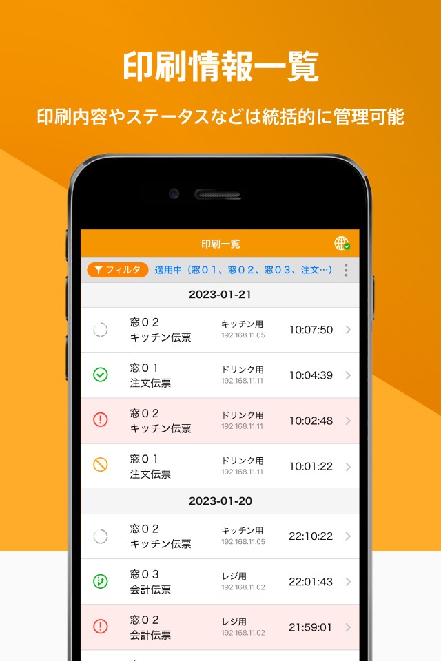 伝票印刷のステータスなどの情報を一覧で表示し、印刷エラーが発生した場合はアラートや警告音でスタッフに通知します。