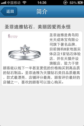 圣菲迪雅是青岛阳光天成珠宝有限公司旗下著名品牌的企业APP,目前拥有8家地面实体店及1家钻石体验店,并在天猫开设旗舰店,致力于使顾客能以线下一半甚至更低的价格购买到高品质的钻石制品。圣菲迪雅为天猫钻石类目品质最高,款式最漂亮,店铺评分最高,顾客评价最好的店铺之一,喜欢的顾客可以放心购买。