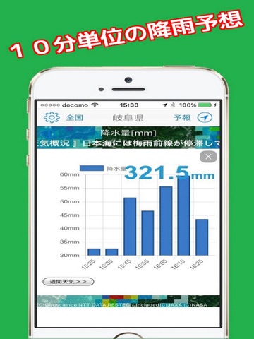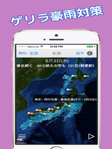 ゲリラ豪雨とか頻繁に起こるようになってしまったので、このような機能があると助かります。 しかし、日本全体は必要ないので、自分の住んでいる県や、市がどうかがわかりやすい方がいいです。 また、時間の経過があるのですか、字が見にくいので、☆2つ。
