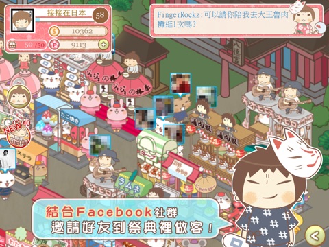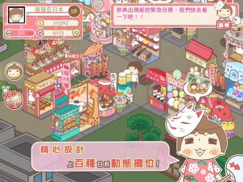 章魚燒、串烤味噌团子、宇治金時剉冰、撈金魚…等各式各樣的攤位讓你發揮創意自由擺設,每個攤位都有逗趣可愛的動態設計,還能夠利用行銷活動來增加攤位的營收;另外,遊戲內也有特別專為接接粉絲設計獨一無二的創意攤位等著你來發掘喔!