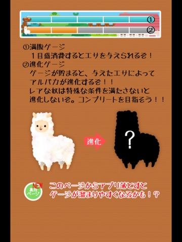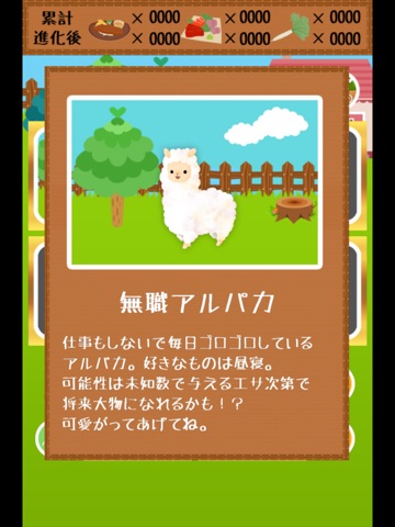 ひたすらアルパカにエサを与えて、進化を促していくアプリです。