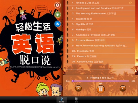 生活对话:浓缩美国生活方方面面。旅游、运动、保健、现代媒介、交通、住房、教育、找工作等真实生活场景再现;