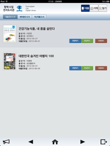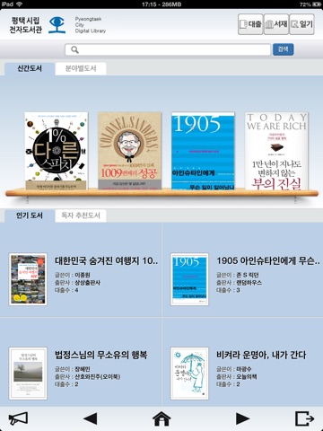 평택시립 도서관 대출회원으로 인증한 이용자를 대상으로 전자책 서비스를 제공합니다. 전자책을 검색, 대출하여 스마트폰을 통하여 언제 어디서든지 책읽기가 가능합니다.