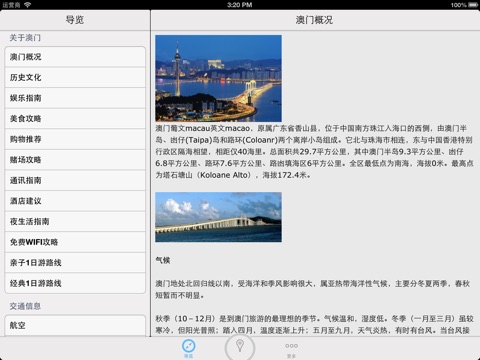 iMacau is an App which develop for people who want to tour Macau,its the best guide app for traveling Macau . Retina display; Works offline;Gorgeous user experience; Road Maps; llots of Macau traveling tips. Up-to-date for 2012.