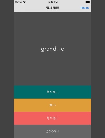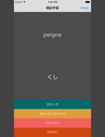 ここでは単語を聞き取るトレーニングをします。スピーカー(イヤホン)から流れてくるフランス語単語に見合う日本語を選択します。分からない場合はスピーカーのアイコンをタップすることで再度音声が流れます。それでも分からない場合は「表示」ボタンをタップすることでスペルが表示されます。結果は成績部分に保存され、あとから間違えた問題のみを学習することもできます。