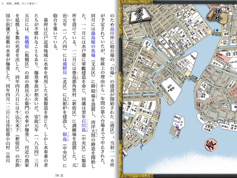収録されている解説文中の地名(青文字)をタップすると古地図の該当箇所にピンがドロップされ、簡単に参照することができます。古地図のみを自由に閲覧することもできます。