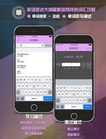 按最新英语考试大纲词汇或最新词汇书整合最新高频核心词汇, 所有单词有音标注释,真人发音,列句,不满足还可以在线词典查询。提供单词测试,单词听写,单词查询功能,单词浏览还有手写记忆功能。
