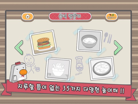 2. 음식 만들기 / 바람불기 / 모양대로 자르기 / 옷 입히기1 / 옷 입히기2 / 물건 채우기 / 짝꿍 찾기 / 동물 친구 찾기 / 같이 해봐요 / 한글 맞추기 테마