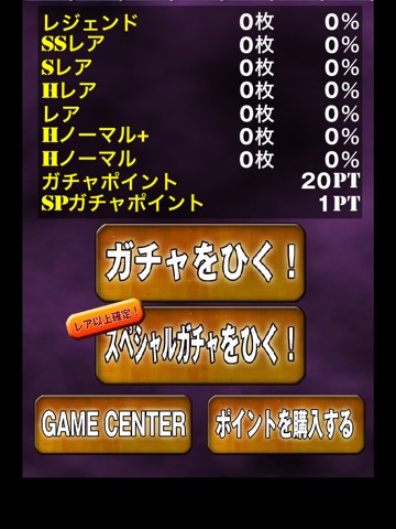 ガチャをひいて、レアなカードを目指そう!!引いたカードは枚数と%表示で君のヒキの成果が一目瞭然!!君のガチャのヒキを発揮せよ!!レジェンド、SSレア、SレアはGAME CENTERにて他の仲間とのヒキを比較できるぞ!!君のガチャのヒキを見せつけろ!!