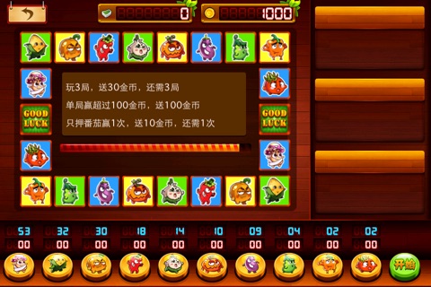 界面由20个方格拼成的转盘,每个方格都有一个目标(多个不同的蔬菜)当压注时间结束后,转盘开始转动,然后停到一个方格上,方格上的图案,与您压注的图案相同时,恭喜您中奖了,中奖的金币为这个图案的倍率乘于您压的注数。图案的没局倍率都会变。增加游戏的刺激性
