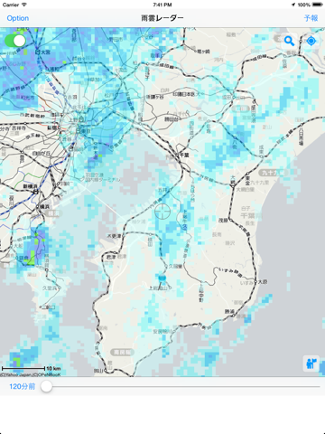 現在の雨雲状態だけでなく、120分前から60分後までを任意に表示できます。