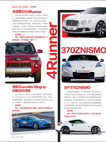 测试:主打汽车性能测试,首创中国汽车运动指数评价体系,用数据库概念全方位评价不同车款运动性能水平。 以“抢鲜试”为代表的试车报告,由本刊资深测试记者撰写,以运动、前瞻、专业、权威的视角,为读者提供最鲜活的汽车资讯,为消费者提供最具指导性的购车参考。