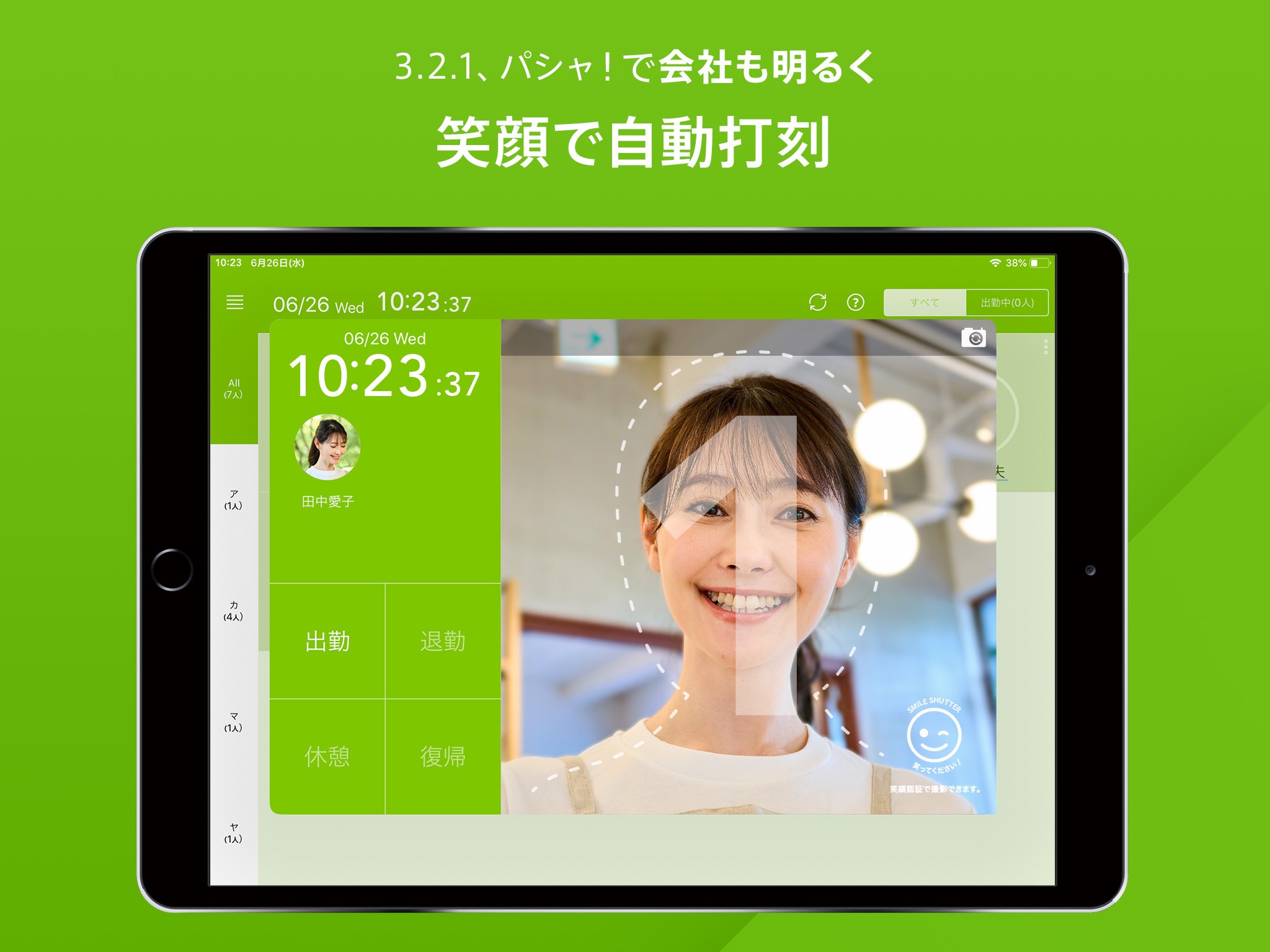 写真撮影 / 笑顔認証撮影 / 位置情報 / 従業員毎のパスコード設定 / ブラウザでどこからでも打刻可能(リモートワークでも!!)