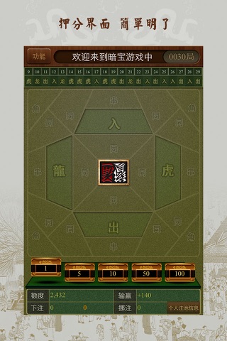 暗宝共有出入龙虎4个方向,4个边角。玩家需要猜测对方放置暗宝的方向,正面有串、入、同3种玩法,边角有一种玩法,打开暗宝后,白色宝对准的方向为开奖的结果。