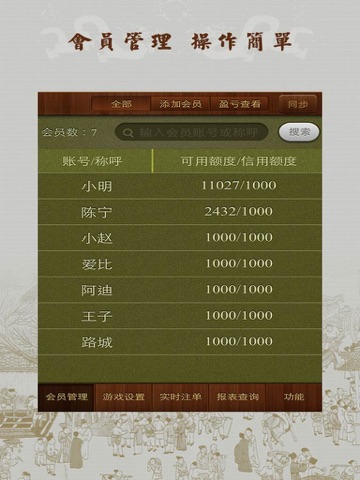 6.玩家管理:房主可管理玩家们的押分信息、赔率设置、账号管理等,方便及时掌握玩家的实时输赢状况。