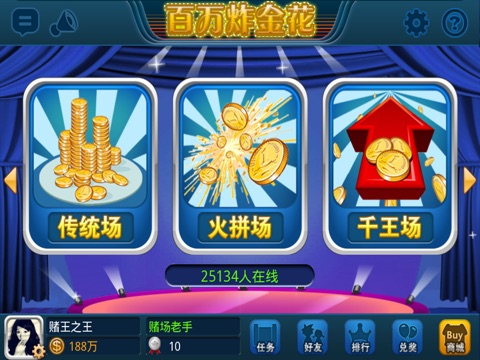 风靡全国的炸金花(又名三张牌、诈金花、金花、扎金花、砸金花、赢三张)以其简单有趣,上手快, 娱乐性强的特点吸引并凝聚了全国最多的玩家。百万炸金花除了沿袭金花本身的经典玩法外,还支持语音聊天,加入了交友、比赛、任务、排行榜、成就等系统,画面极尽简洁精美,奖励丰厚,体验刺激。每日上万玩家同时在线,瞬间开始游戏!