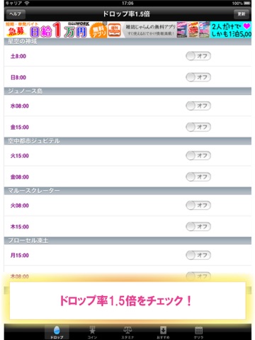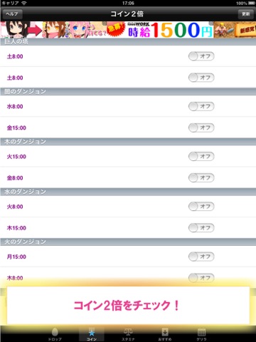 特にダンジョンの曜日や時間帯でボーナスのボーナスタイムを通知する機能を備えているので超便利。