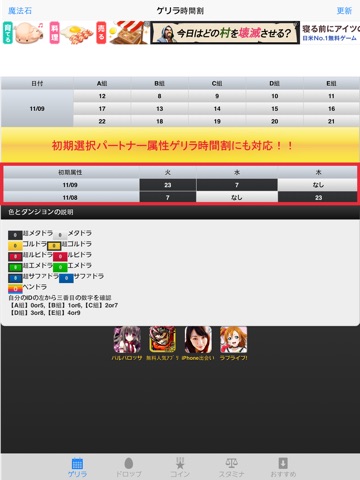 パズドラでは不定期にゲリラダンジョンやボーナスダンジョンが登場しますが、本アプリではゲリラダンジョンの時間割とボーナスダンジョンのスケジュールを公開しています。