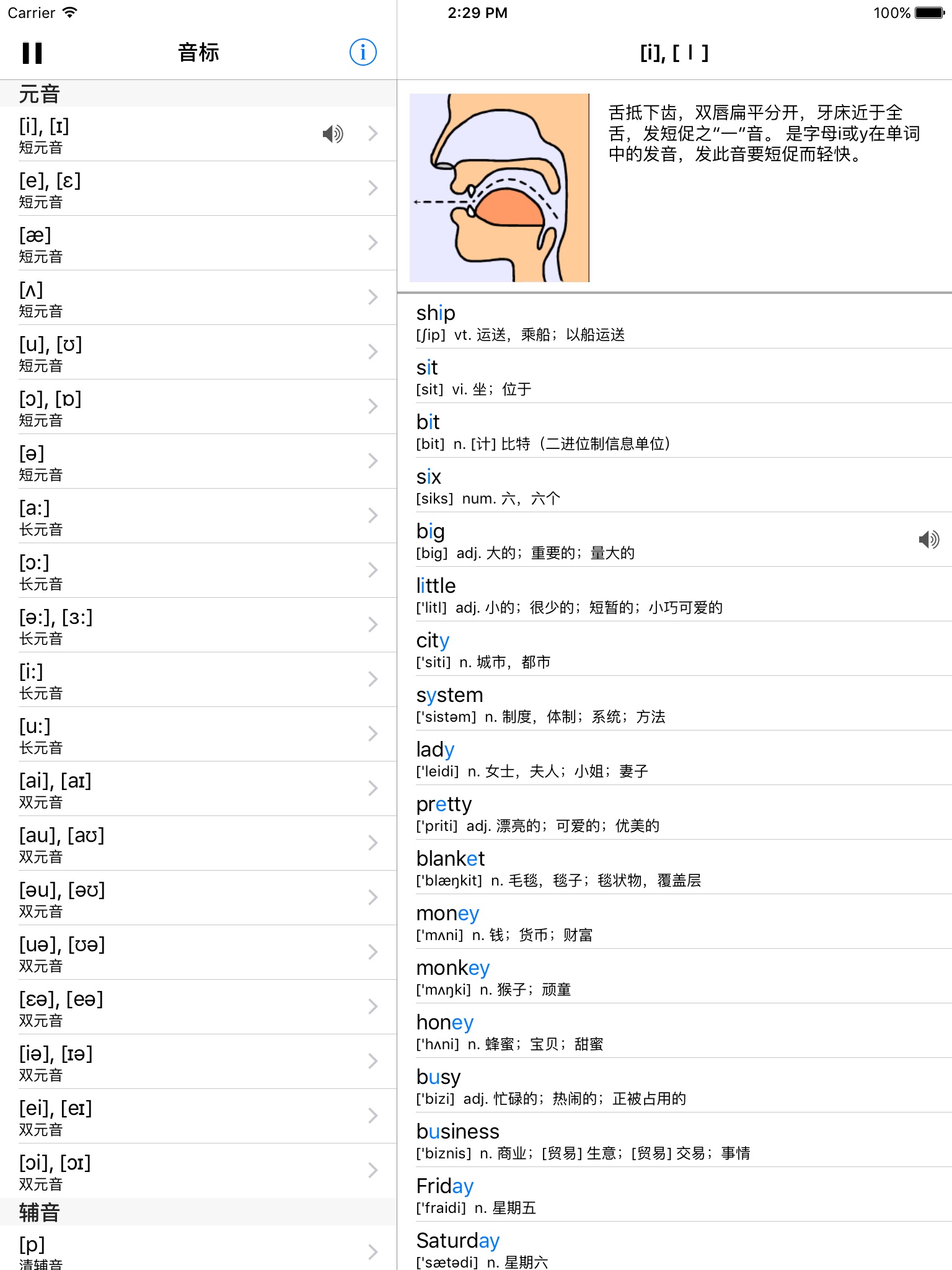 内含48个音标的真人发音,并且以图片的形式直观的描述发音的口型、舌尖的位置及气流的方向。并且列举了一些和这个音标有关的单词。可以让你在学习发音时体会及熟悉掌握音标。
