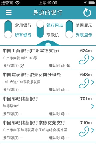 我们给你提供了搜索范围设置、网点还是ATM设置、常用银行设置,帮你更快地找到你的目标;有网点点评和评级共你参考,选择最安全,最近,人最少的,就是你要找的;如果不知道怎么去,我们还给你规划路线,指引你到达目标。当然你用完了网点,也可以发表一下你对网点的印象,评级,也方便别人使用嘛!