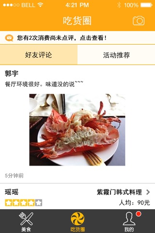 饭评还搭建了一个您与好友分享美食的互动平台,即吃货圈。您对已消费过的注册餐厅的评价信息、时刻分享的美食信息将以信息流的形式出现吃货圈,相信这些信息对您的好友的美食选择会有很大的帮助。同时,吃货圈还通过定位的功能,向您推荐周围5公里范围内的餐厅促销活动,以满足您的就餐需求。