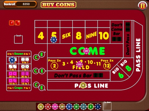 Experience the thrill of realistic casino craps with beautiful HD graphics. Simple and intuitive layout that features all of the common bets found in the real version of the game. Bets include pass line, dont pass, come, dont come, place, field, big 6, big 8, any seven, any craps, the hardways and more.